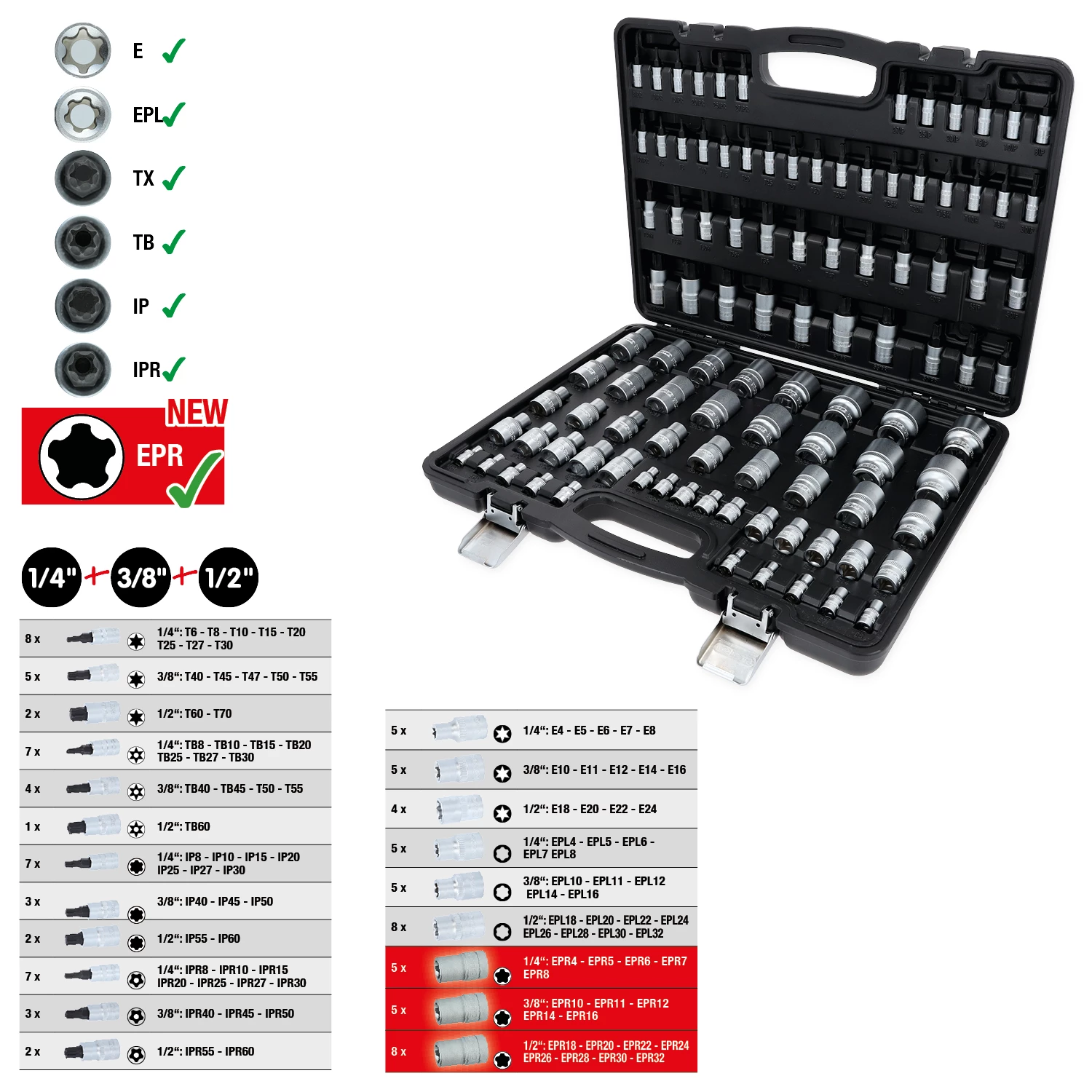 1/4"+3/8"+1/2" Torx hylsnyckelsats. 101-delars