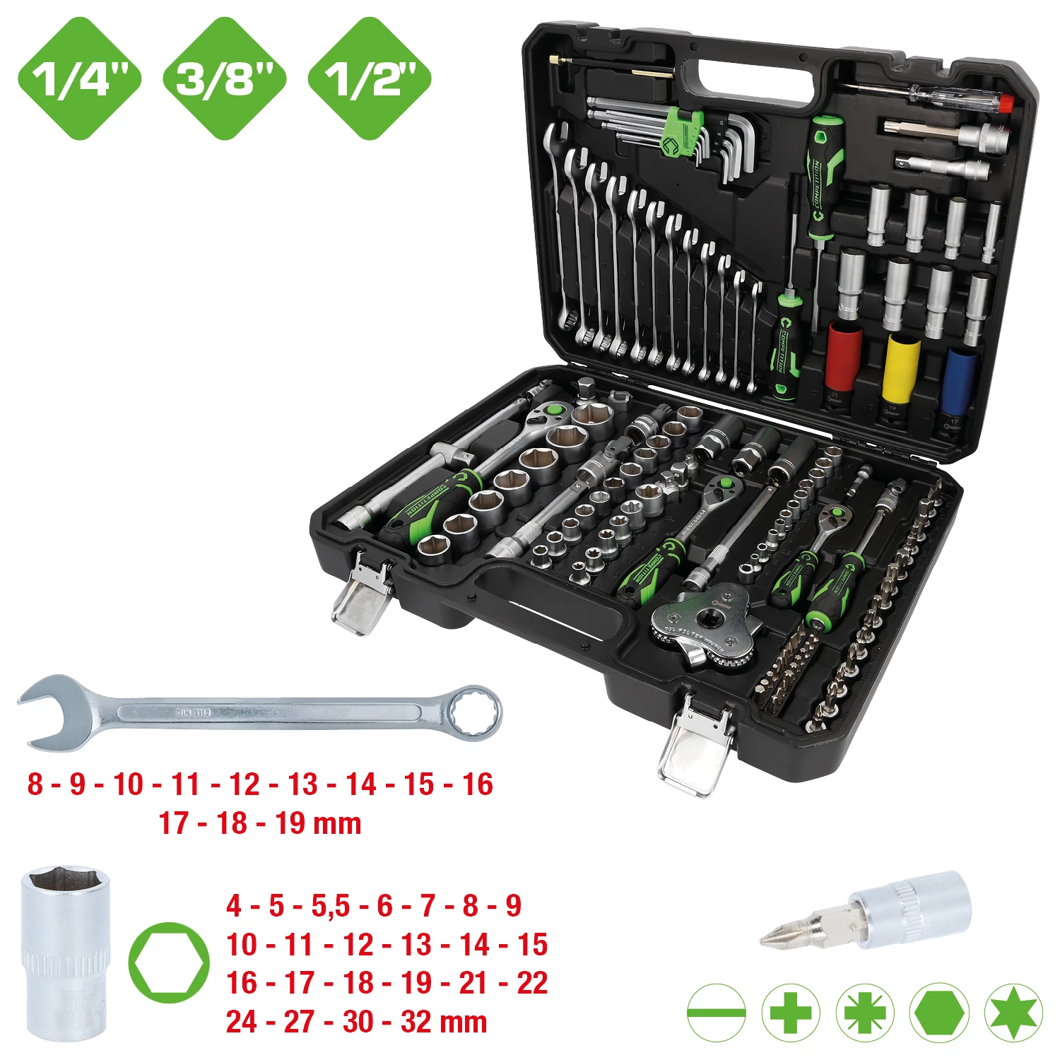 COMPETITION hylsnyckelsats. 132 delar. för motorfordon. 1/4 tum + 3/8 tum + 1/2 tum