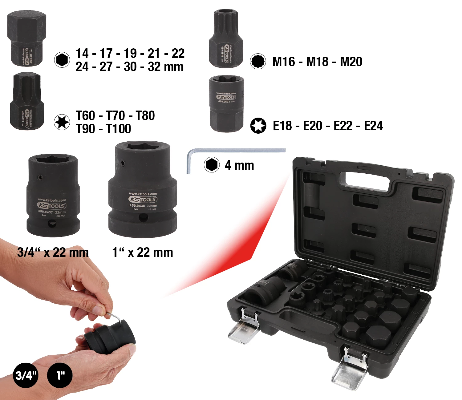 Krafthylssats. 23 delar. 3/4 tum + 1 tum