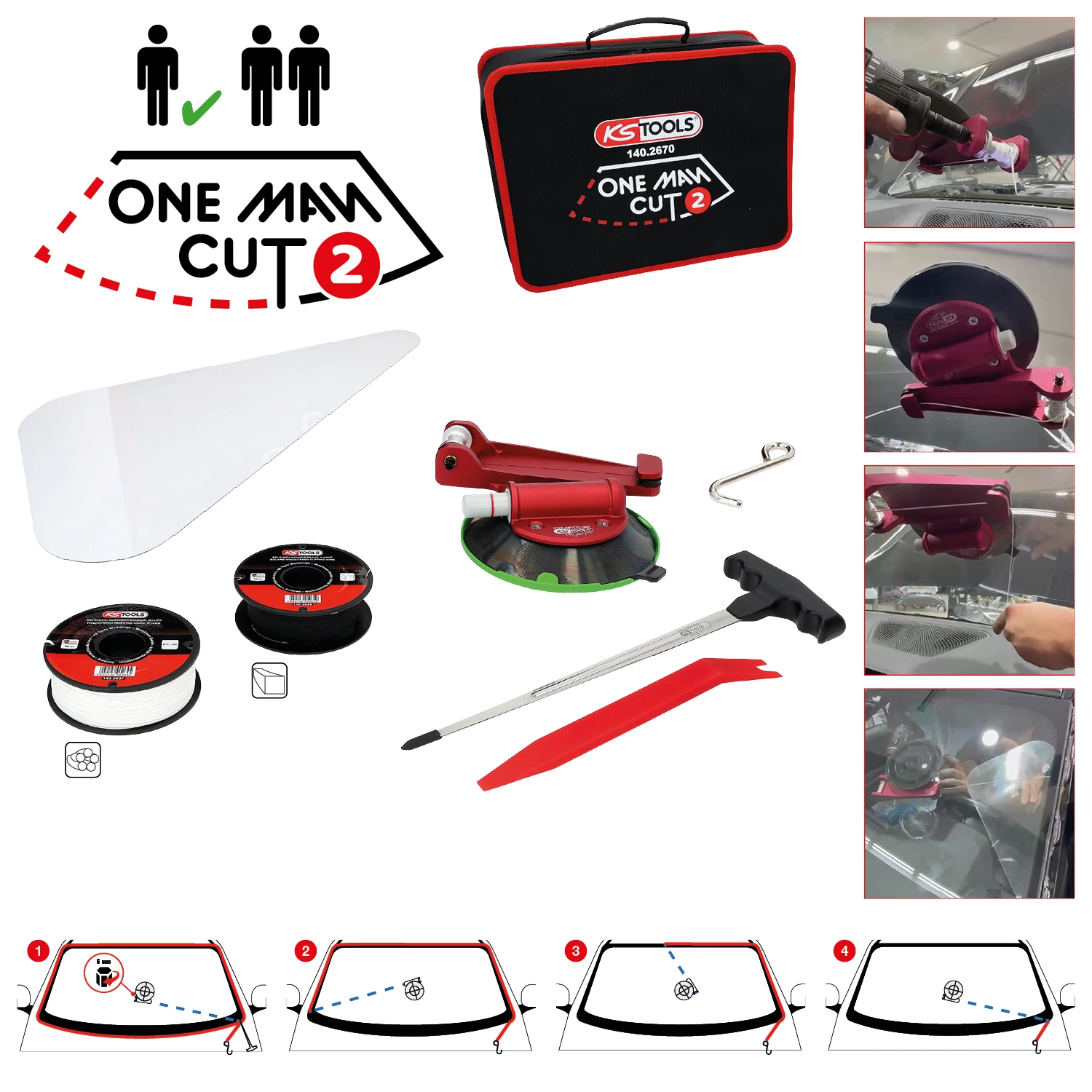 - idealisk för korrekt och skonsam demontering av limmade vindrutor samt de flesta bak- och sidorutor